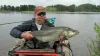 Asp II (aspius aspius). Float tubing angler catching an asp. Warning: sudden loud music!